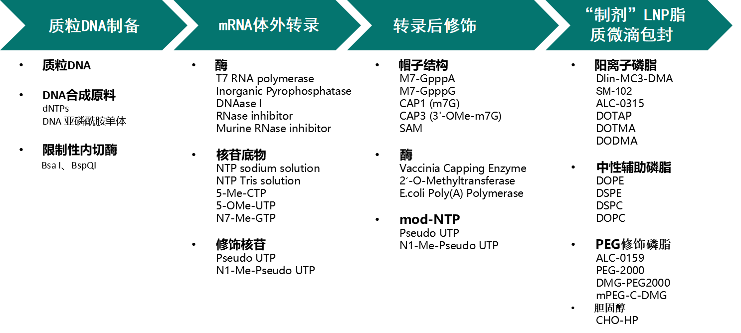 mRNA疫苗的研发及生产涉及多个环节,一般包括:病原确认、抗原序列设计、质粒构建与扩增、mRNA体外合成、纯化、递送系统装载等一系列环节。作为一家以生物化学和医药中间体研发、生产和销售为一体的科技创新产业平台,华纳生物拥有丰富的产品线,可以向生物技术研究和产业提供专业支持。应对当前备受瞩目的mRNA核酸疫苗研究与开发,合肥华纳生物已推出修饰核苷/亚磷酰胺/IVD原料/mRNA疫苗原料/LNP脂质体/荧光染料等系列产品,并持续推进现有产品的升级与新品的开发工作,以助力疫苗产业快速化发展。
