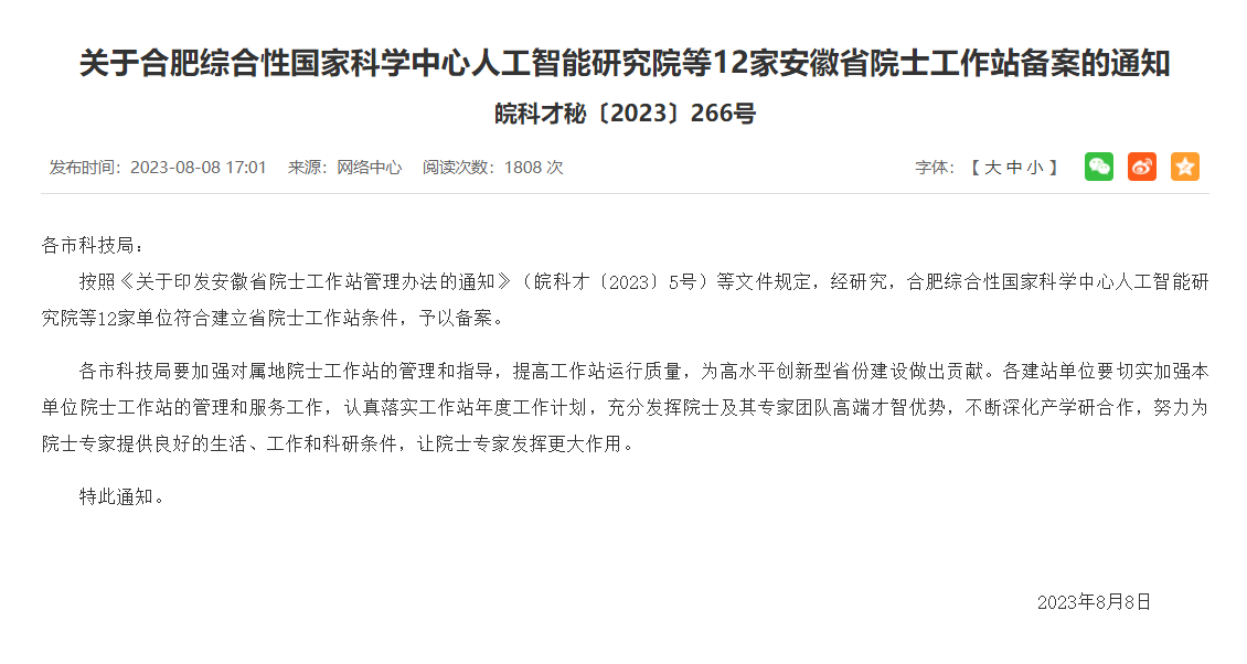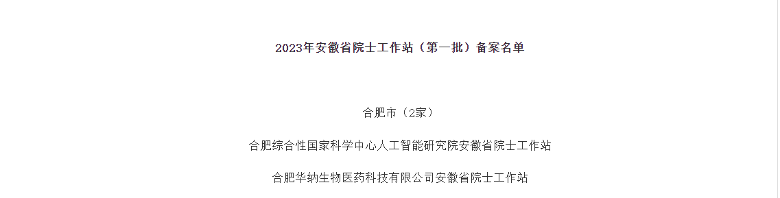 2023年8月8日,经安徽省科技厅批准,合肥华纳生物医药科技有限公司通过安徽省院士工作站备案。